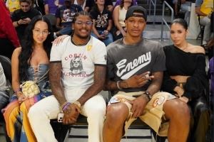 体育资讯8月22日讯 昨日太阳球员、火箭旧将杰伦-格林携40岁的女友Draya与前队友小贾巴里-史密斯及其女友一同场边观战WNBA飞翼VS火花的比赛。今日火箭队记Bradeaux发文谈到这张合照。