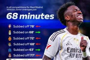 天空体育统计了本赛季至今维尼修斯在皇马的出场时间,他仅有三场比赛打满全场,至今13场比赛场均出场时间仅68分钟。